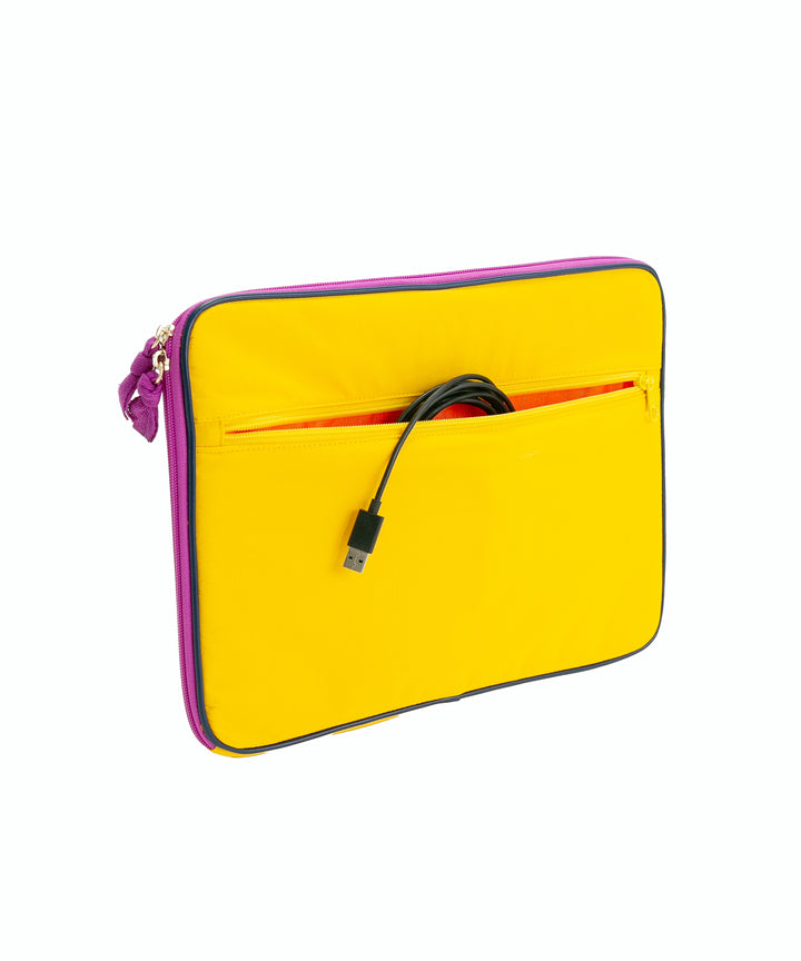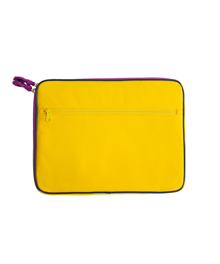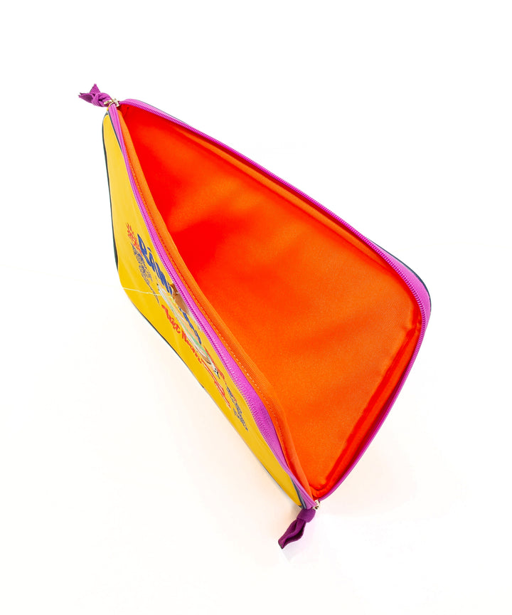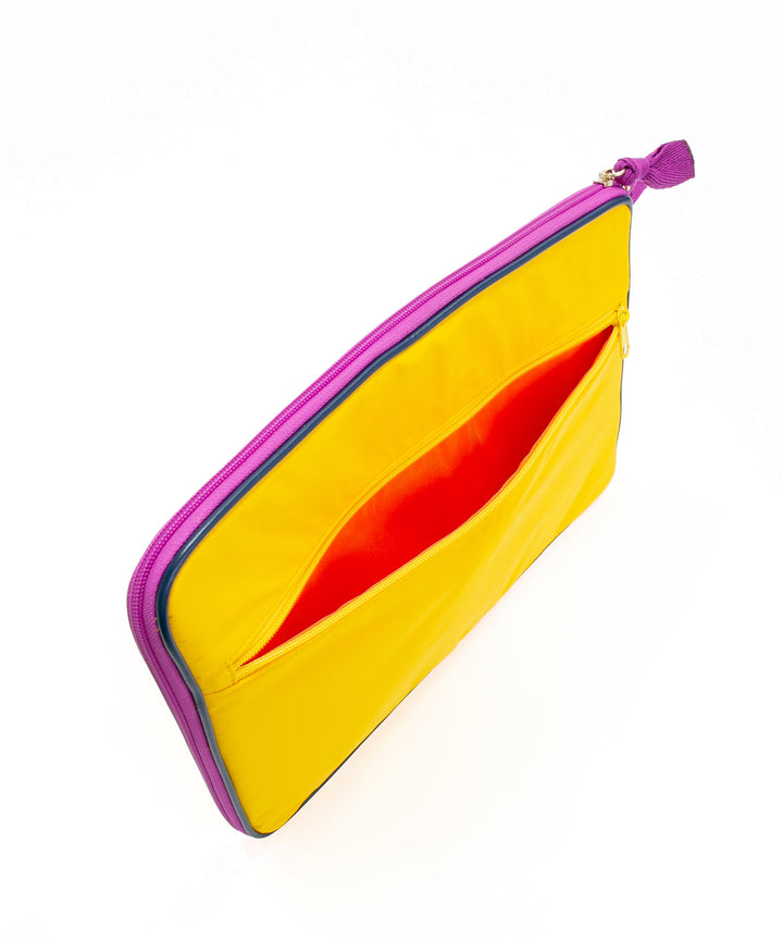 サラリとしたイエロー生地にネイビーとパープルが効かせ色になったデザインで、中を開けると鮮やかなオレンジの生地!