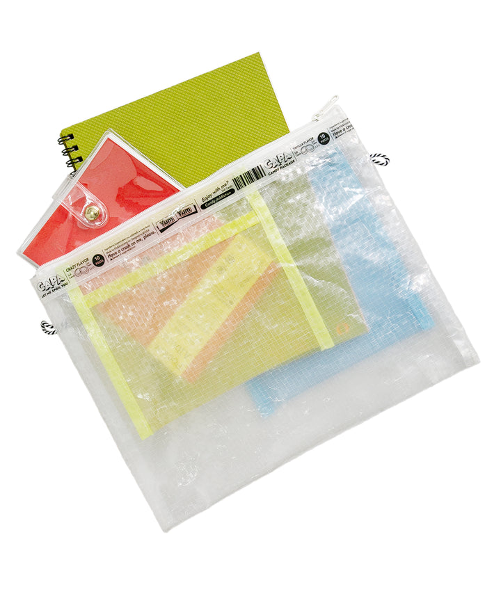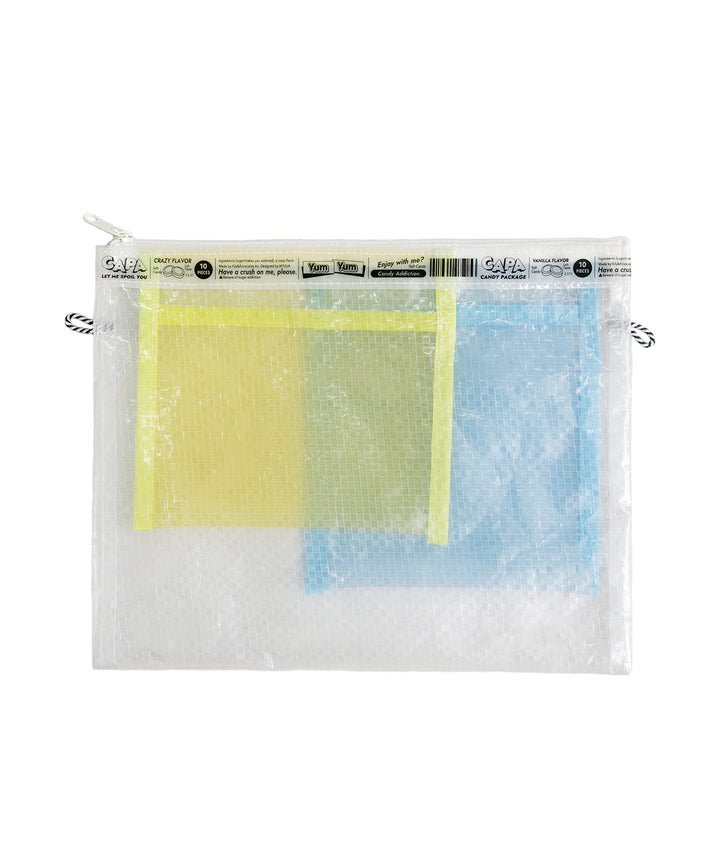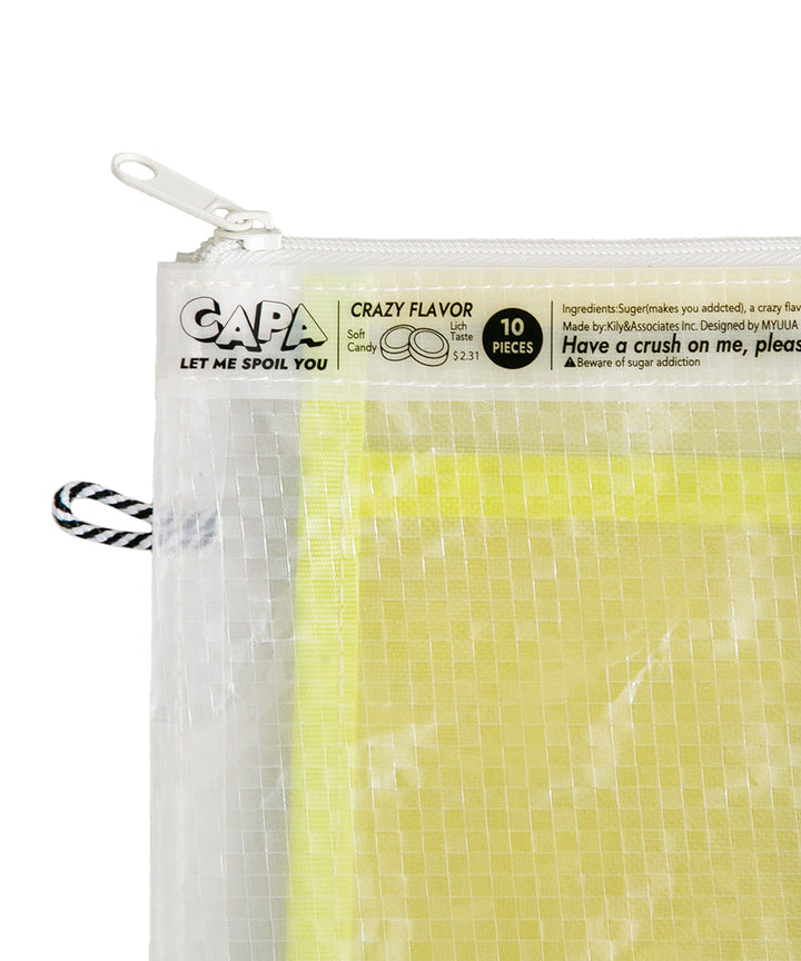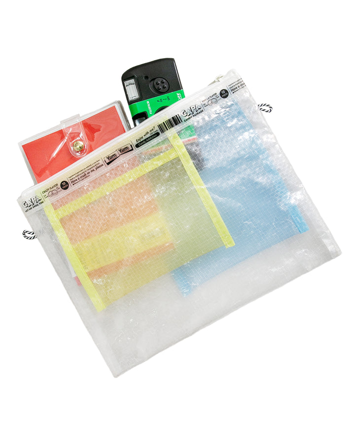 アメリカのPOPでクラシカルなお菓⼦のパッケージの可愛さを表現した新しいキャリングケースのブランド。シースルーの2⾊のポケットがついて、重なりあった部分は第3のカラーにもなっているのがポイントです。⽂具の仕分けにとっても便利。⼤サイズのポケットにはスマホも⼊ります。両サイドについたループ紐を活かせば、キーリングを付けられたり、ショルダーポシェットとしても使⽤できます。3種類の異なる⽣地を使⽤することで、異素材MIXの⾯⽩さと様々なシーンで使えるアイテムです 。