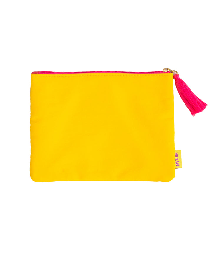 本体にはマットなイエローの素材を使用し、ピンクの刺繍がMYUUAらしい鮮やかさをプラス。