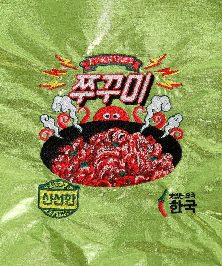 一口食べたら止まらない、クセになる辛さが魅力のチュクミ鍋。その美味しさをユーモアたっぷりに刺繍で表現しました。