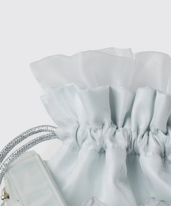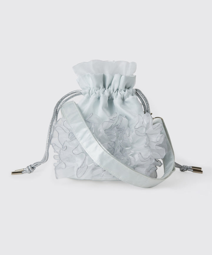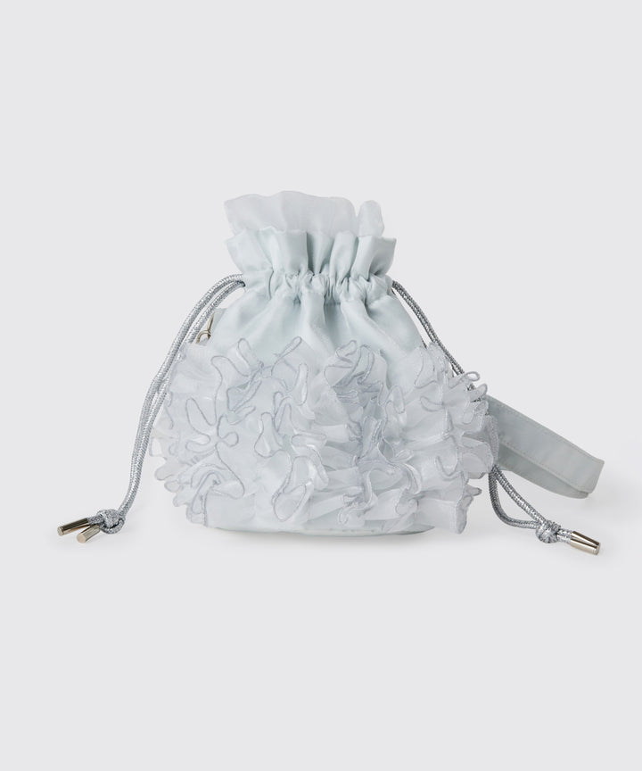 存在感あるフリルがアクセサリーのような巾着バッグ。