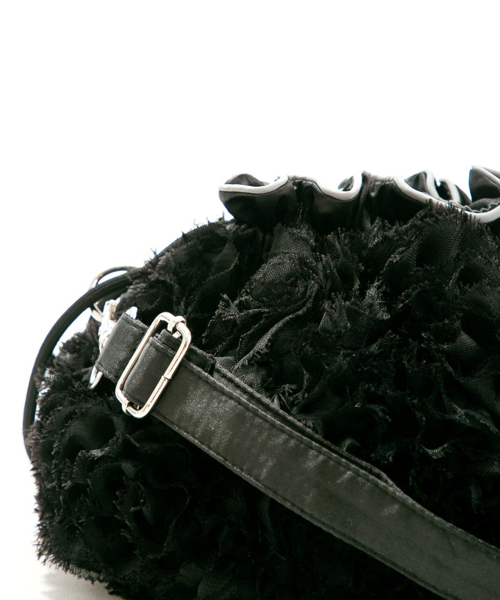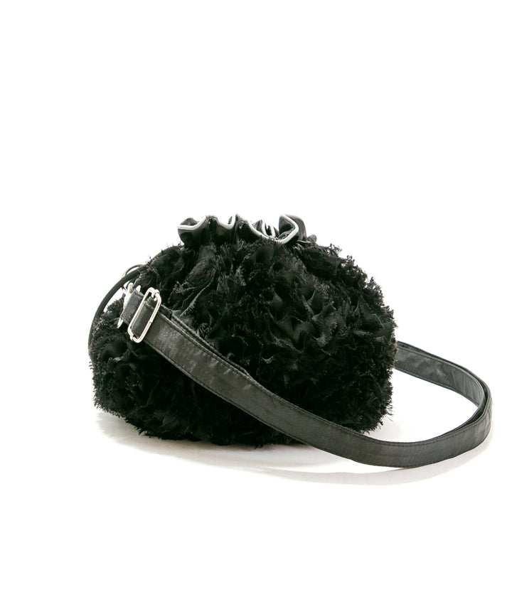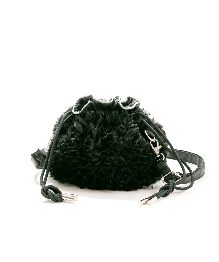 ふわふわとしたファーのようなリボンフリルがアクセントになる巾着ショルダーバッグ。