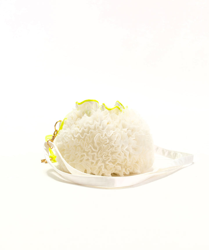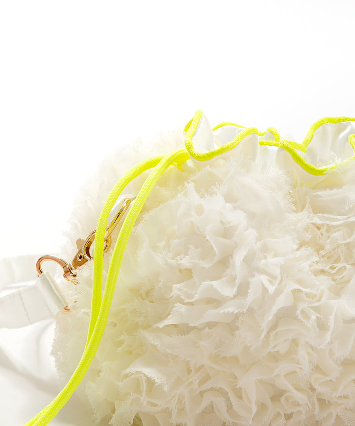 ふわふわとしたファーのようなリボンフリルがアクセントになる巾着ショルダーバッグ。